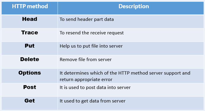 Whenever request made to a server it has some kind of method attached to it. That method indicate the action to be perform for a given resources. Except some common features Each of them implements a different semantic.